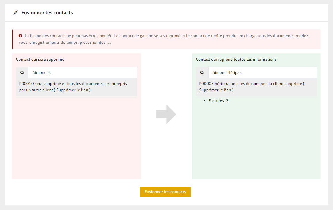 La fusion d'un client ne peut PAS être inversée. Il convient donc d'y prêter attention. Lors de la fusion :