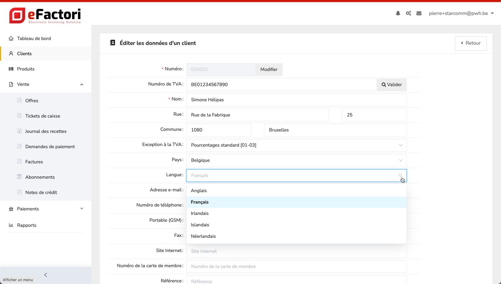Vous pouvez gérer les langues que vous voulez offrir dans l'application "[clients étrangers](https://efactori.gitbook.io/efactori.be-fr/modules/clients-etrangers)" de eFactori.