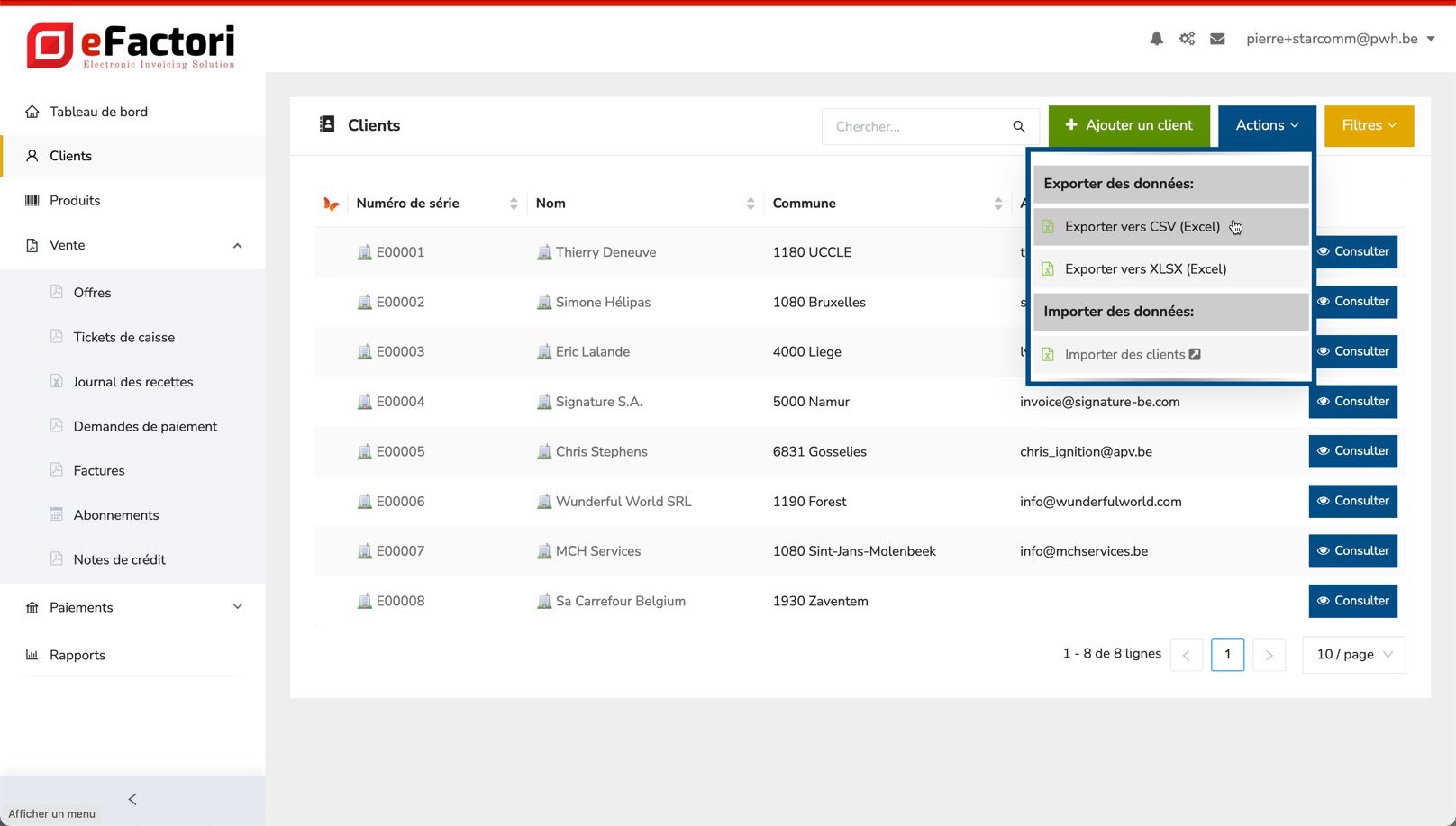 En partant des clients importés vous pouvez exporter des données en un simple clic depuis eFactori, ce qui se fait par le bouton bleu "Actions" en haut à droite. Le téléchargement d'un fichier csv ou Excel se fait de la même façon.