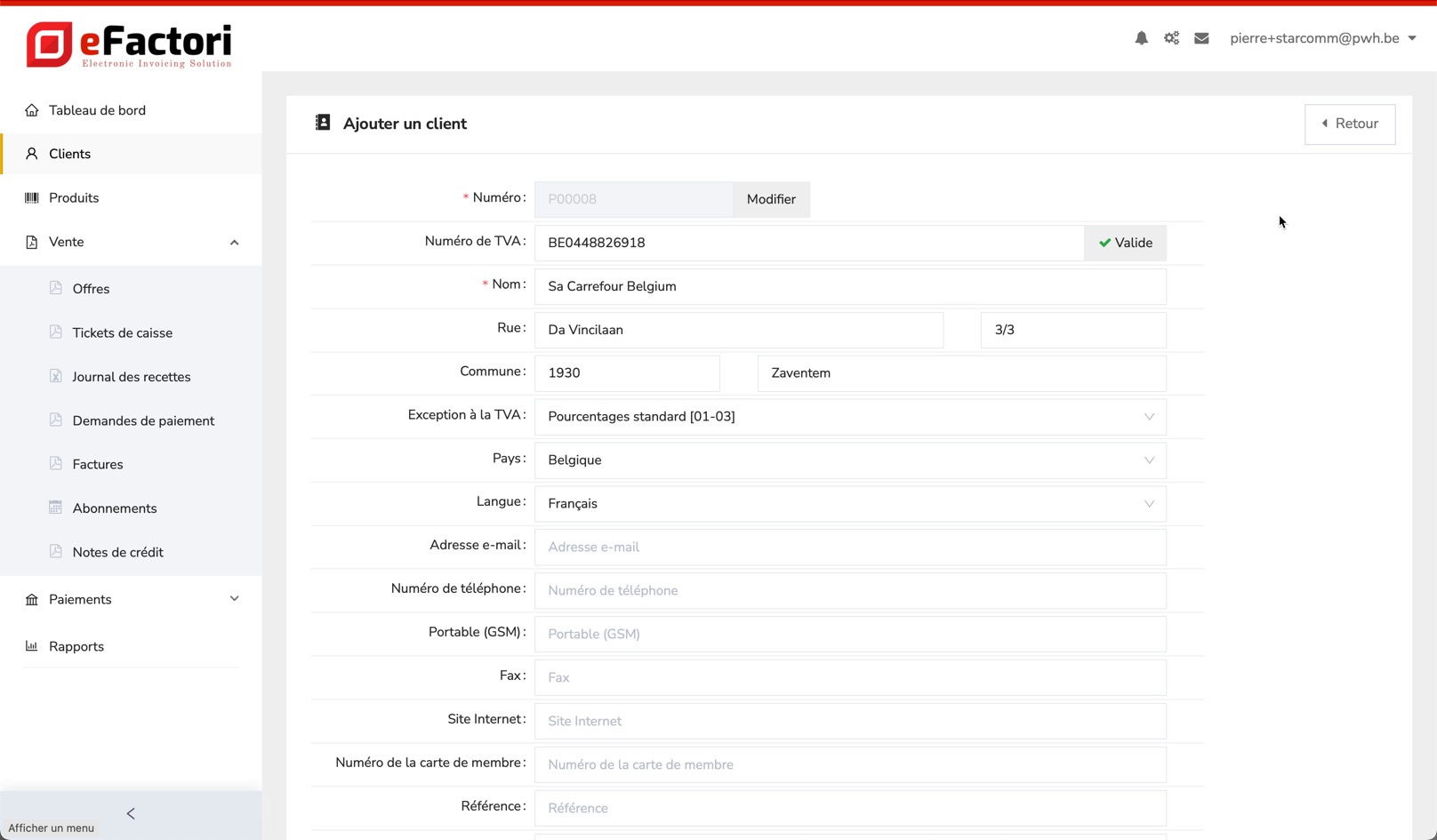 Quand vous avez rempli toutes les données, cliquez sur le bouton vert "Ajouter" en bas. Vous pouvez toujours éditer dans eFactori la fiche client, comme les autres entités en utilisant le bouton jaune 'Modifier'.