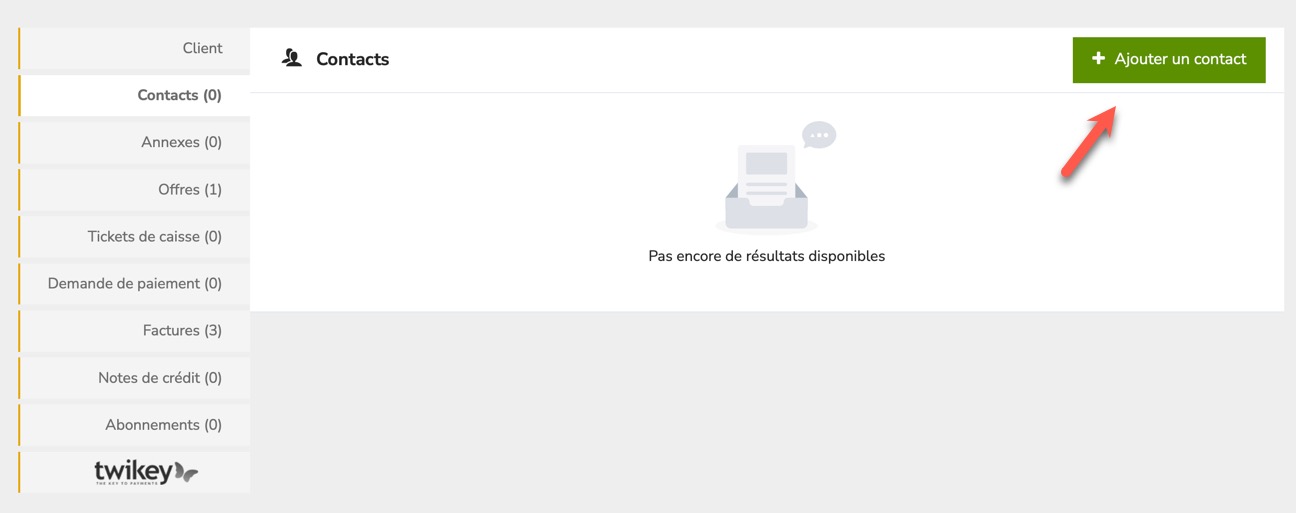 Si votre client est une entreprise, vous pouvez ajouter un service ou une personne de contact spécifique au sein de cette organisation. Le bouton vert "Ajouter un contact" vous permet d'ouvrir un nouveau fichier.