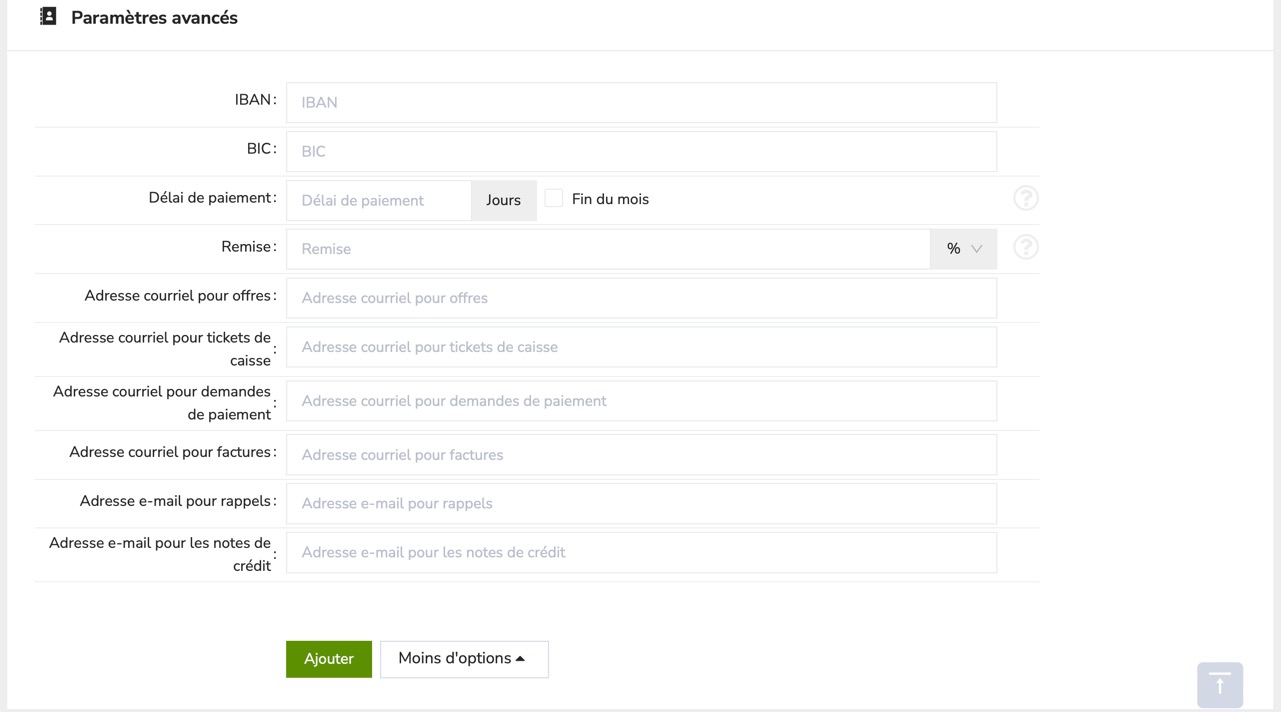 Les informations de base par client peuvent être complétées par d'autres champs. Elles se trouvent à la fin de la fiche client, derrière le bouton "Plus d'options". Les champs suivants sont disponibles :