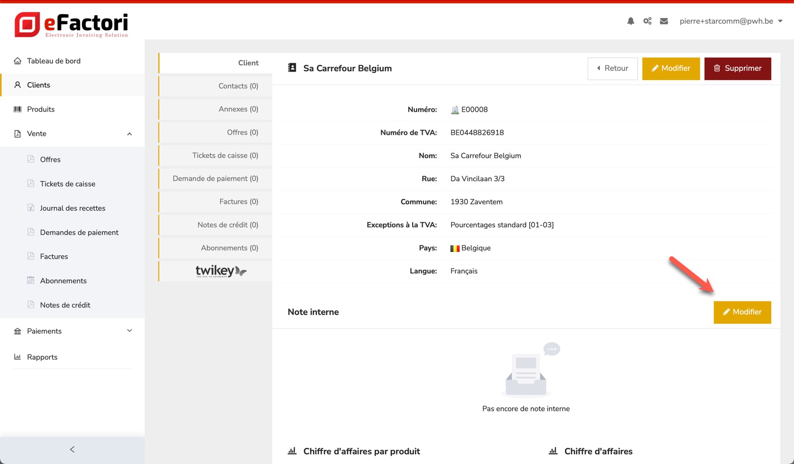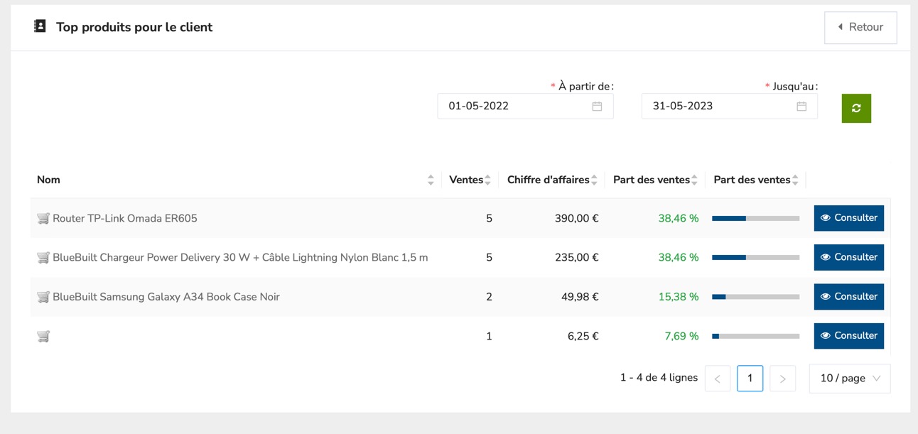 En bas de la fiche client, le chiffre d'affaires général lié à ce client apparaîtra, ainsi que le chiffre d'affaires de ce client par produit. eFactori base le calcul sur les factures, les tickets de caisse et les notes de crédit enregistrés.