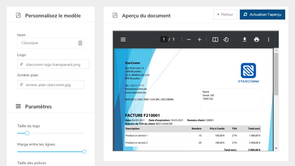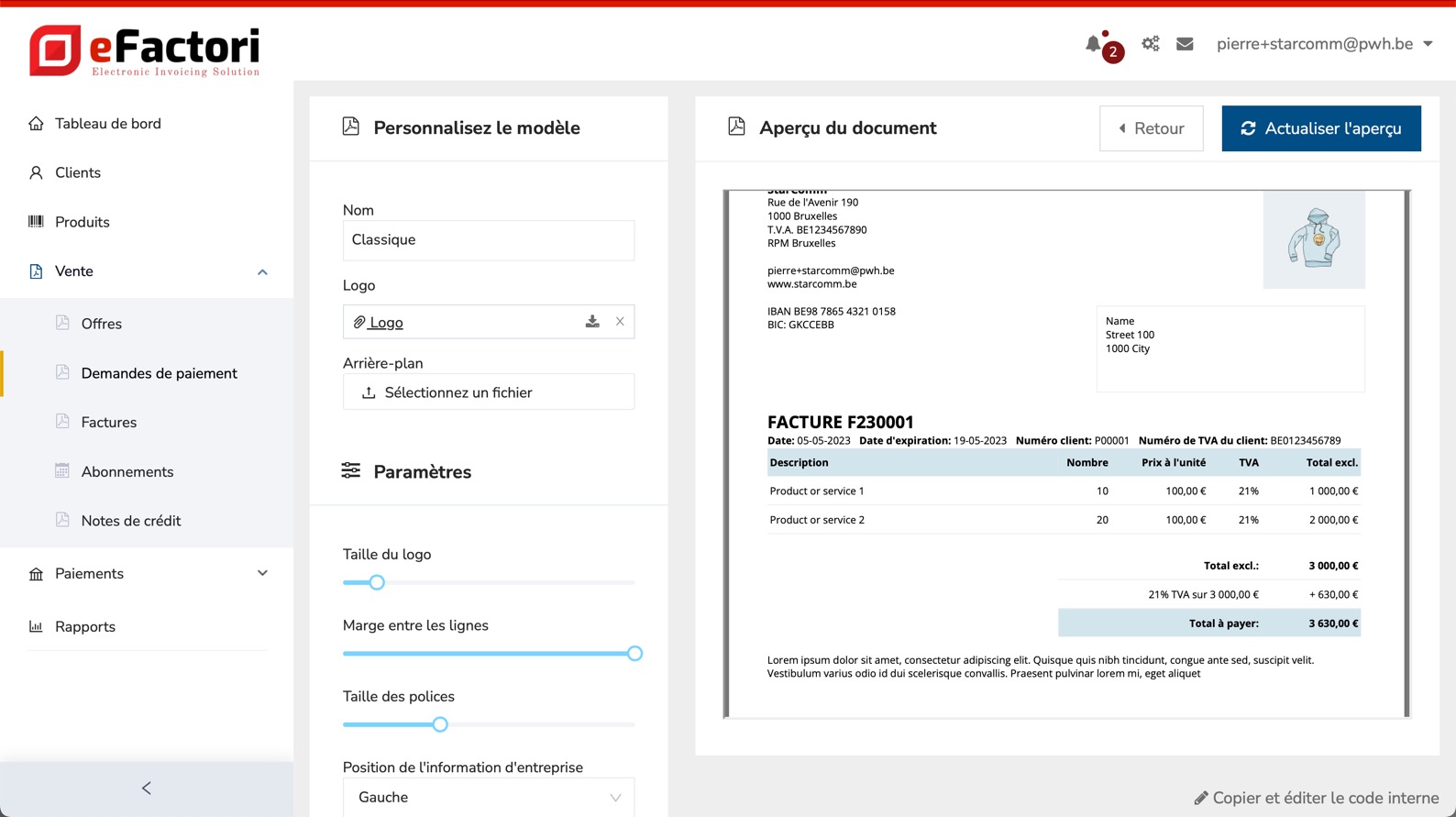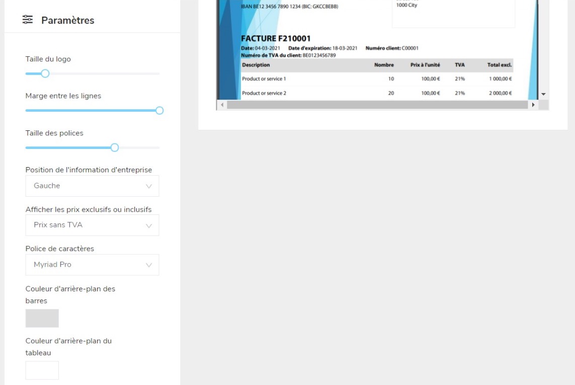 Avec eFactori vous savez facilement modifier la présentation de vos factures en utilisant les paramètres de l'entreprise.‌