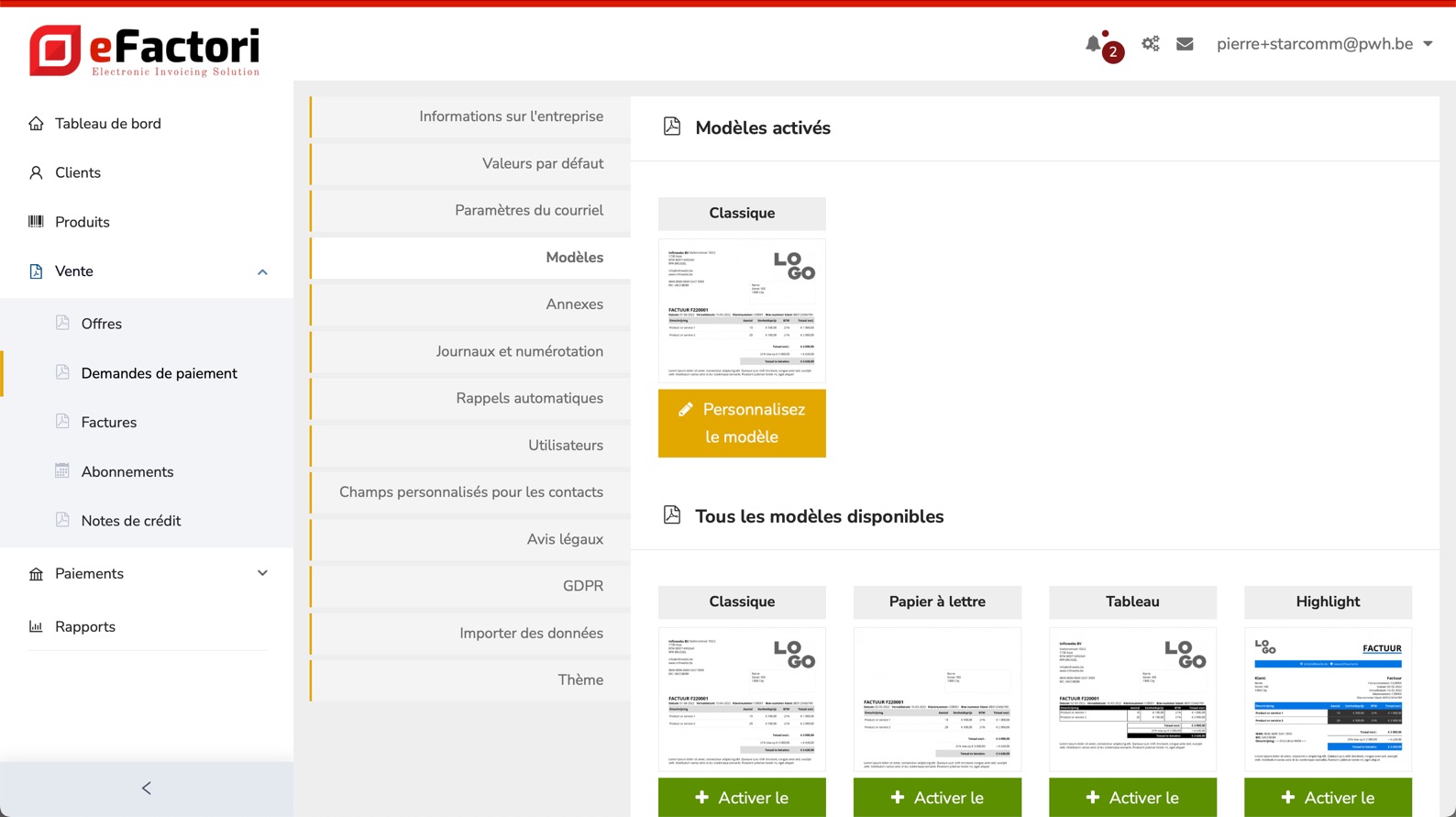 Vous pouvez créer et enregistrer plusieurs modèles. De cette manière, vous donnez selon vos préférences aux documents une mise en page spécifique. Découvrez les possibilités de dynamiser votre identité d'entreprise avec eFactori !​