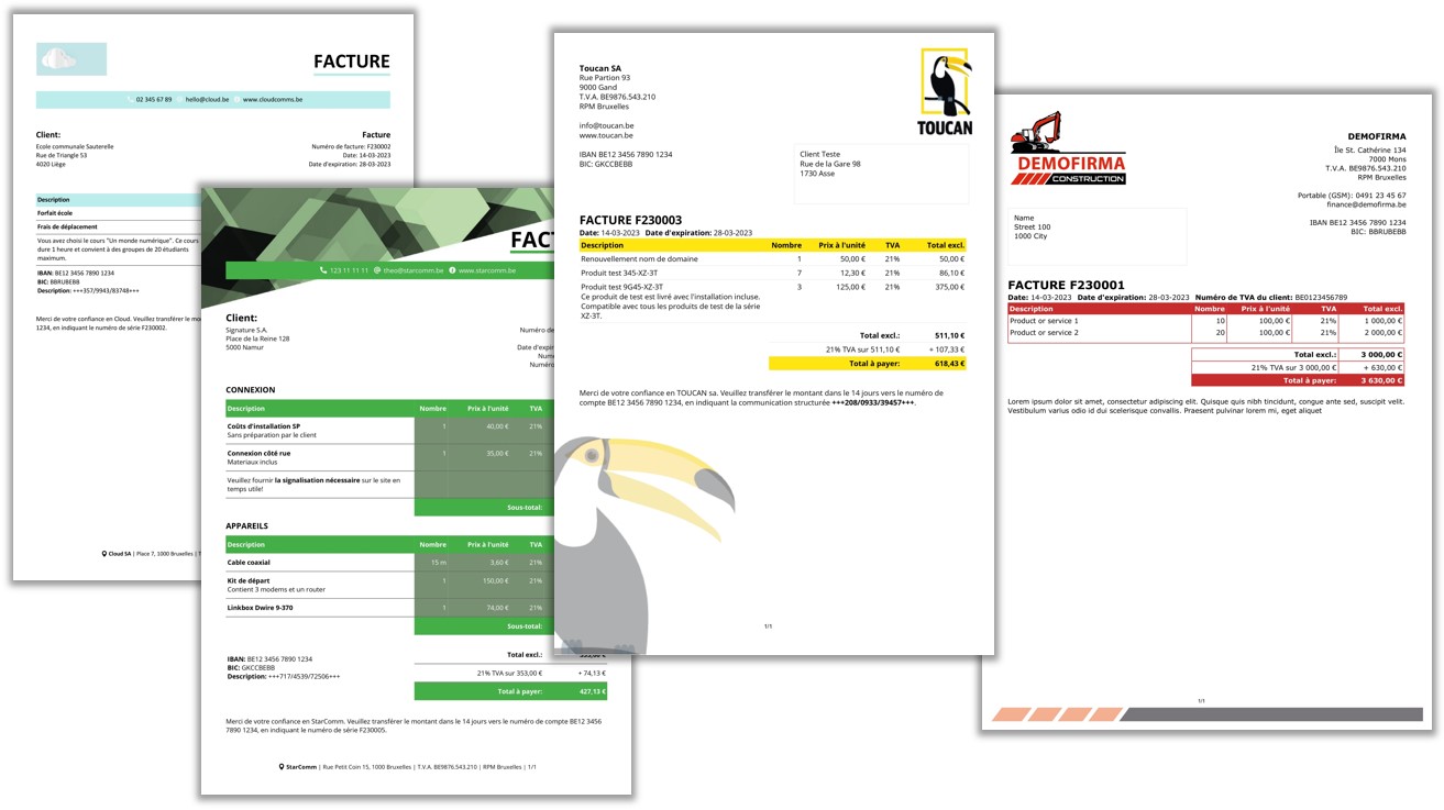 Un modèle dans eFactori fait référence à la conception visuelle rassemblée de vos documents ou e-mails. Le contenu de ce document est converti en un fichier PDF avec le design des modèles et peut ensuite être envoyé. Les modèles de documents peuvent avoir un aspect très différent, en fonction de vos paramètres :&#x20;