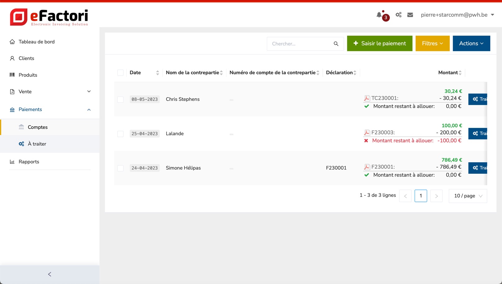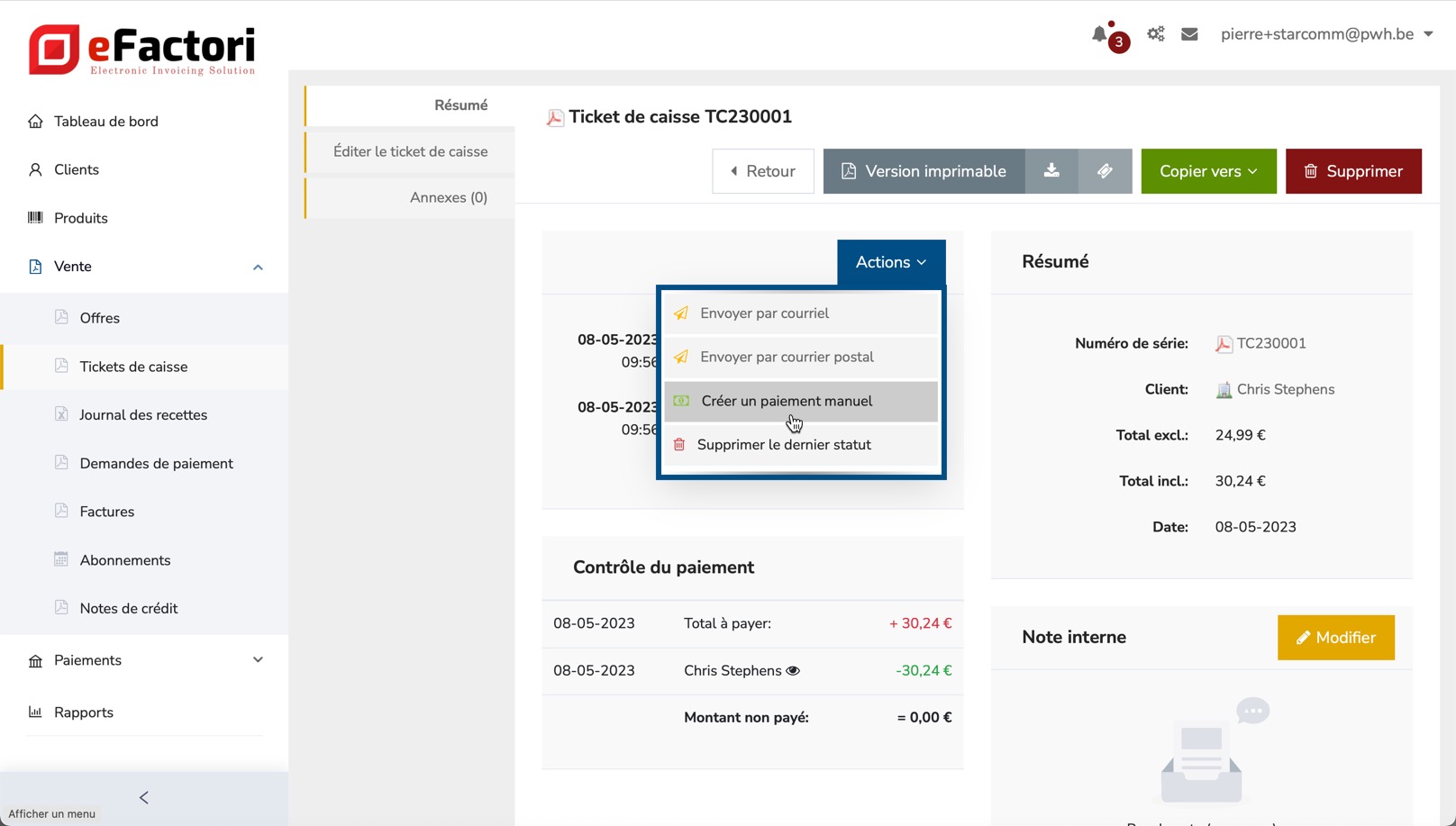* Vous pouvez changer manuellement le statut en "payé". eFactori indiquera qu'il n'y a pas encore de paiement exact lié à ce statut.&#x20;