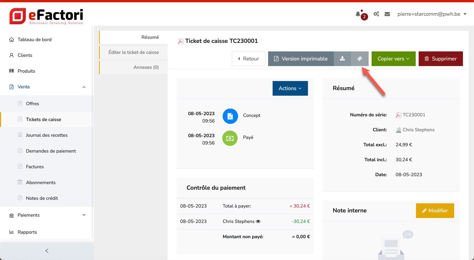Dans l'écran récapitulatif des tickets de caisse, vous verrez un bouton "billet" à côté du bouton habituel "Version imprimable".