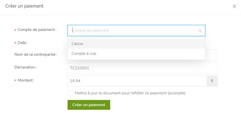 * Vous pouvez créer manuellement un paiement, de cette façon vous liez le ticket de caisse directement à un compte de paiement. Il est préférable de choisir cette option.