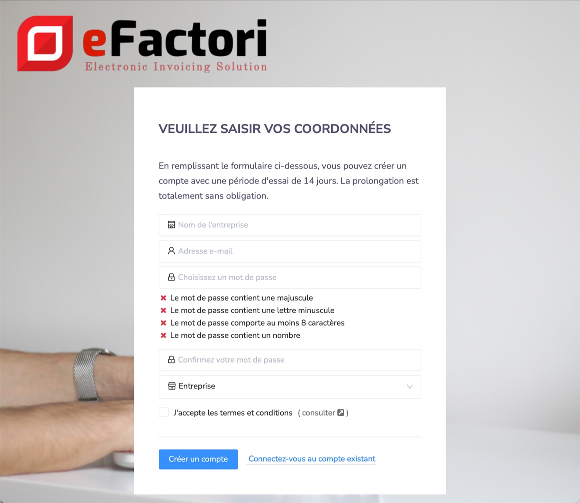 Pour créer un compte eFactori, rendez vous sur [https://app.efactori.be](https://app.efactori.be/#/user/login?lang=fra).