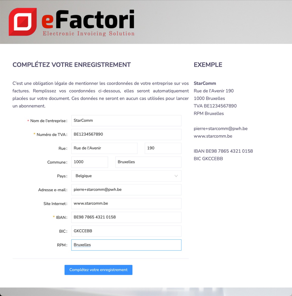 Pour créer immédiatement une première facture, eFactori a besoin de certaines données sur l'entreprise. Ceux-ci apparaîtront sur la facture. Au fur et à mesure que vous remplissez les détails, l'exemple dans le coin supérieur droit deviendra plus complet. Si les données sont remplies, cliquez sur le bouton "Complétez votre enregistrement" en bas de la page.