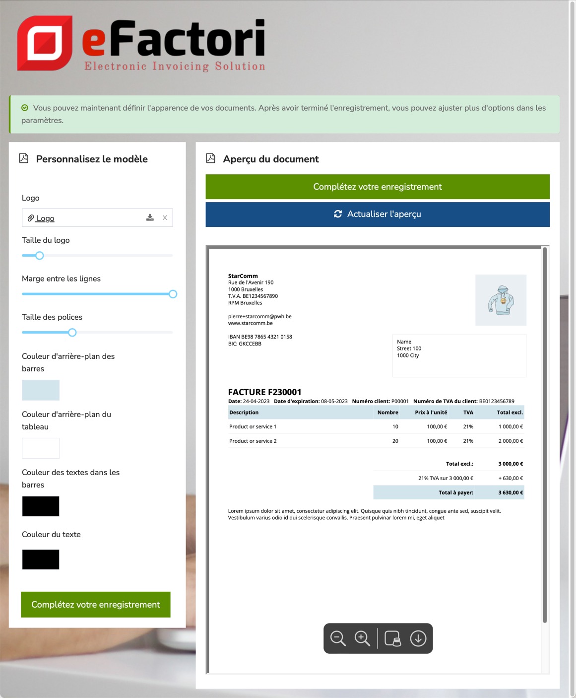 Vous pouvez déjà apporter des ajustements au modèle (= la mise en page du document). Avez-vous saisi votre site web dans l'écran d'enregistrement ? Ensuite, eFactori adaptera immédiatement votre modèle au style de votre entreprise. Des paramètres de personnalisation plus avancés seront disponibles après l'enregistrement.